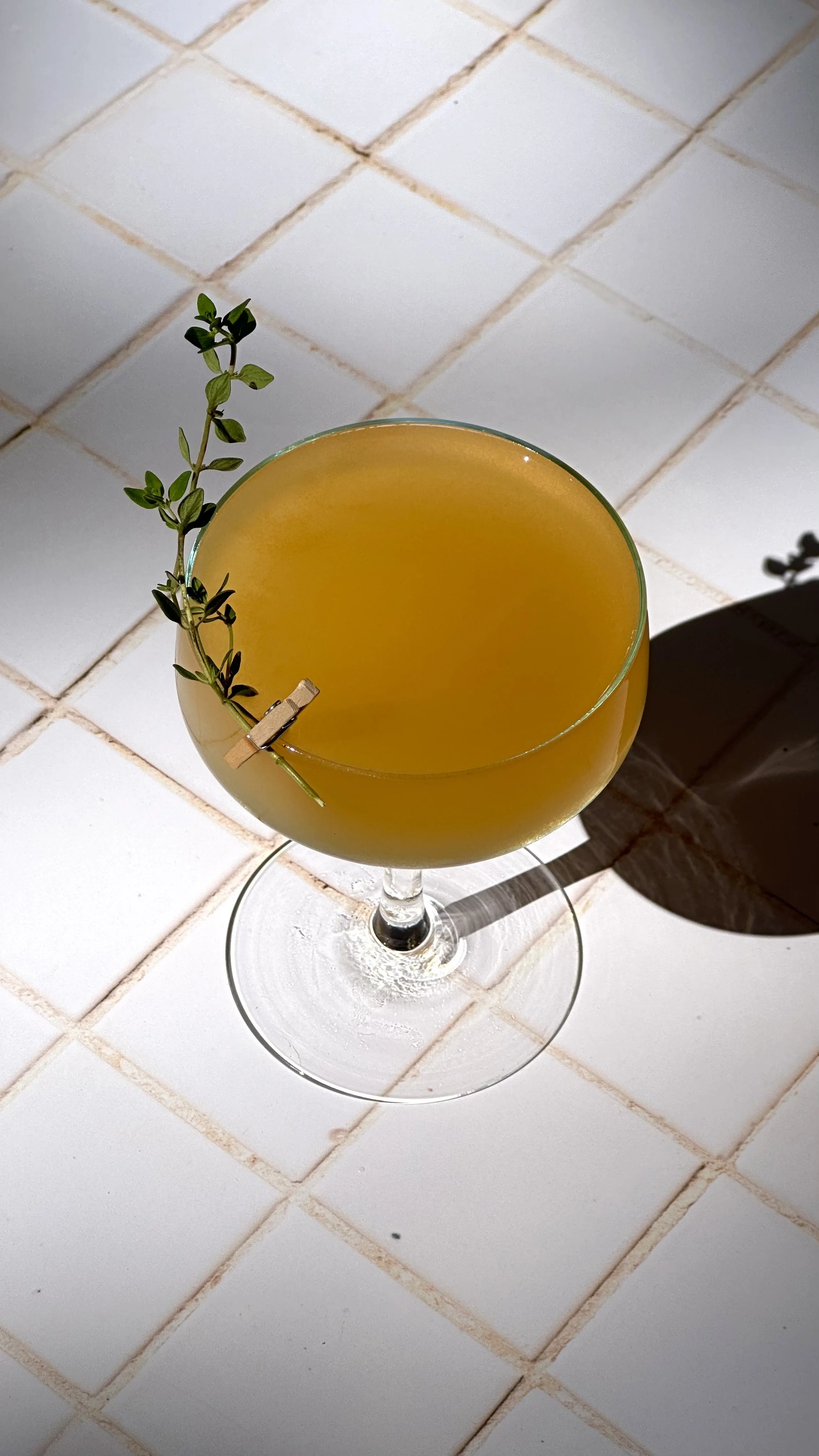Add all ingredients to a cocktail shaker with ice and shake until chilled. Double strain into a chilled coupe glass. Garnish with a thyme sprig.