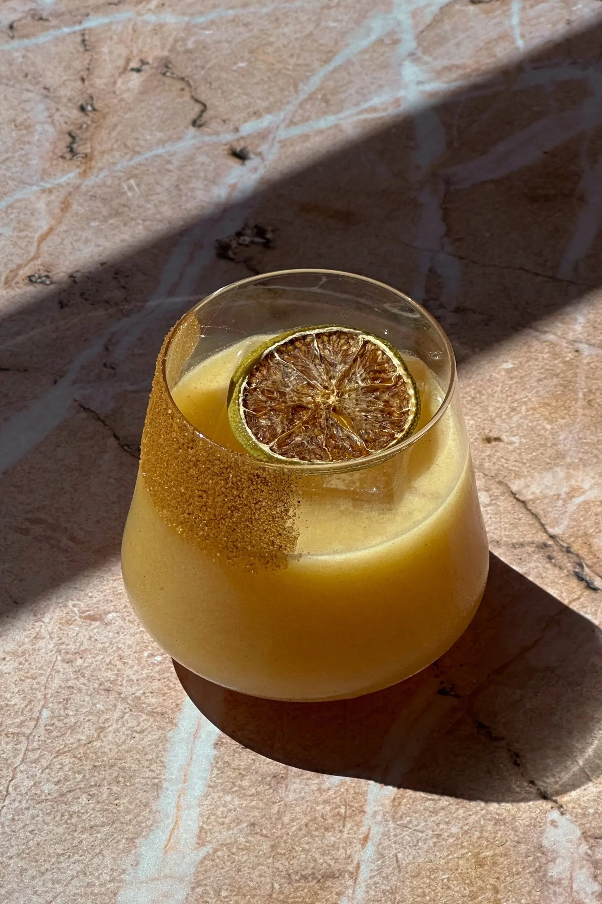 garnish: habanero sugar/cinnamon rim, lime wheel