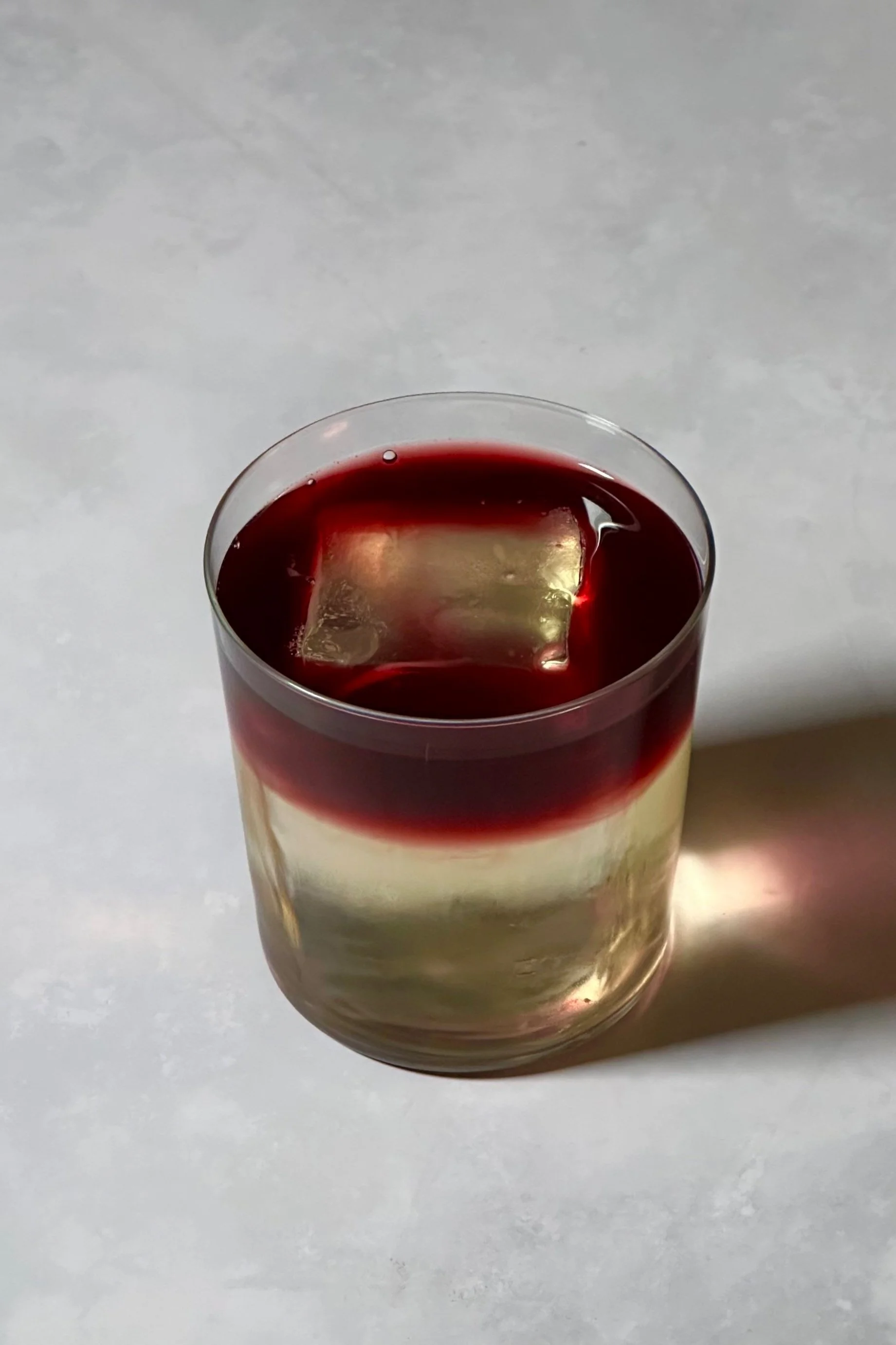 To serve, pour over a large ice cube and float with a bit of red wine. Cheers!