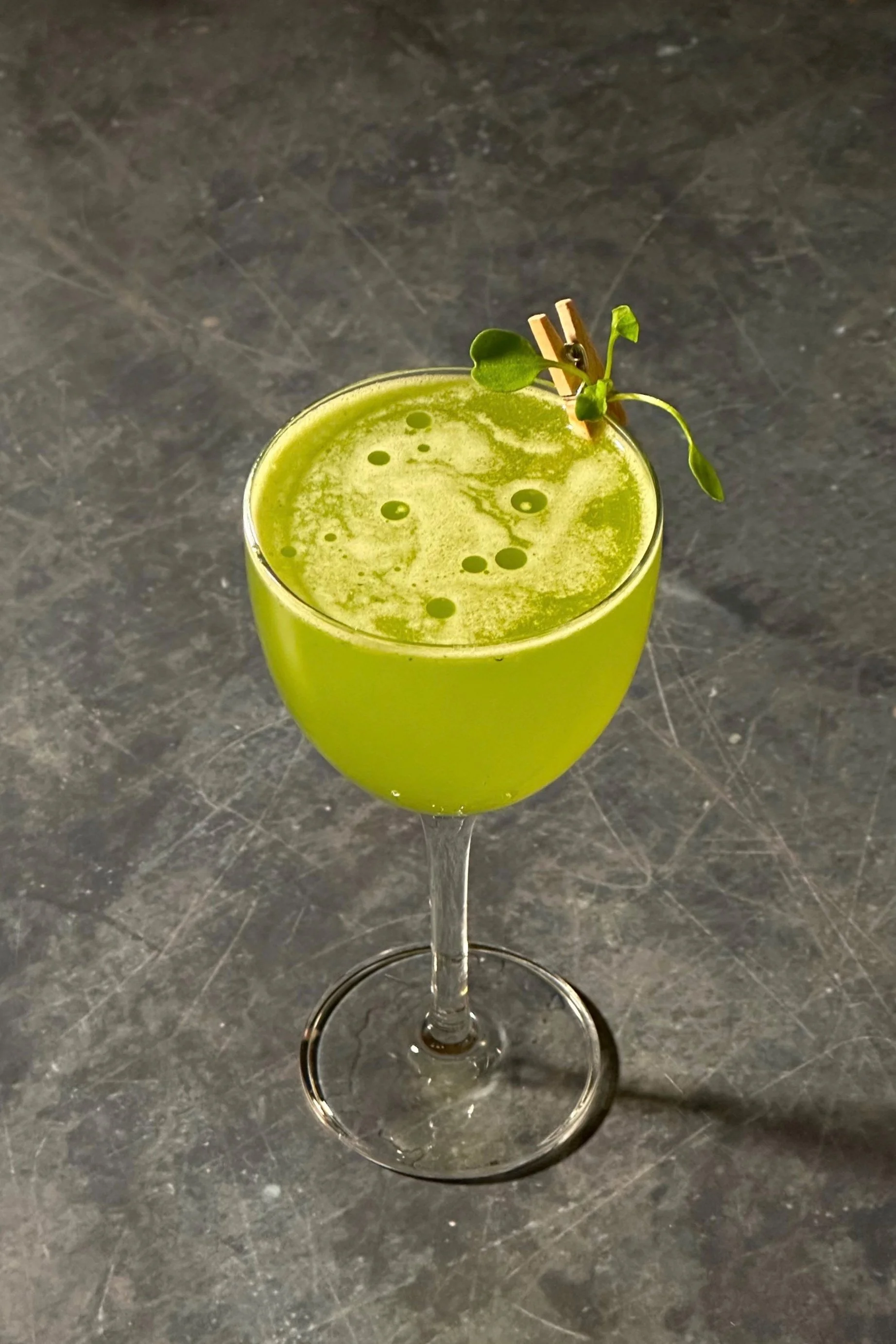 Add arugula, syrup, lemon juice, and champagne vinegar to your cocktail shaker and gently muddle. Add vermouth and vodka along with ice and shake (hard) until chilled and the drink is green. Double strain into a chilled coupe glass. Garnish with a few drops of arugula herb oil and an arugula leaf.