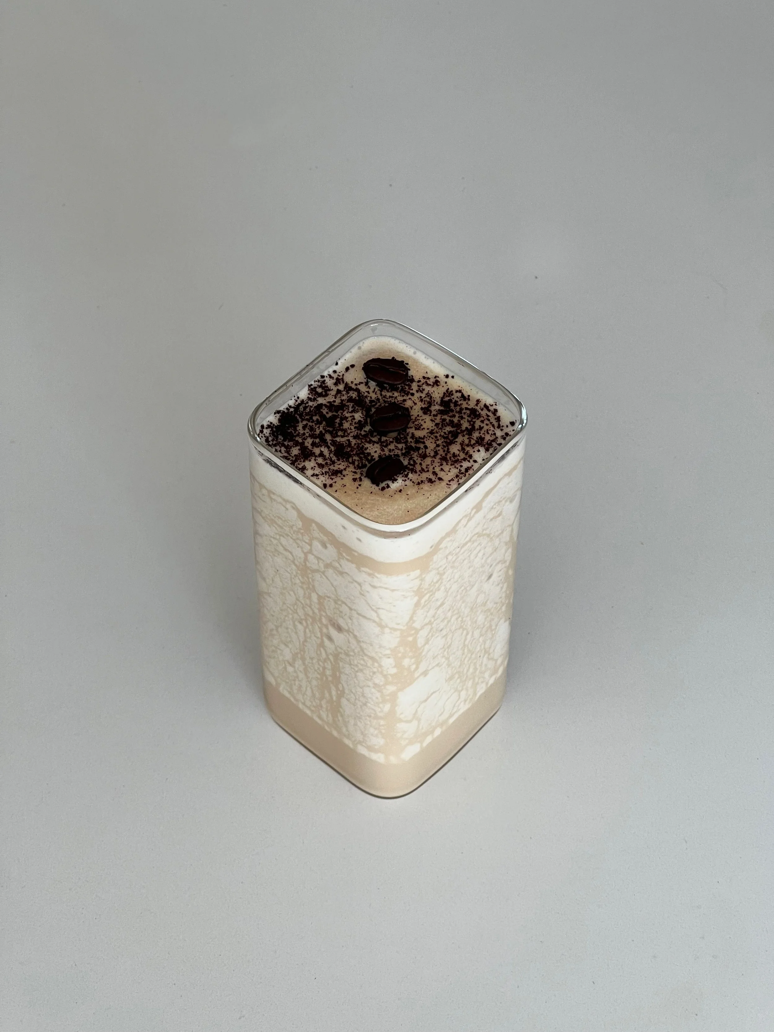 Pour into desired glass and garnish with coffee grounds and coffee beans.