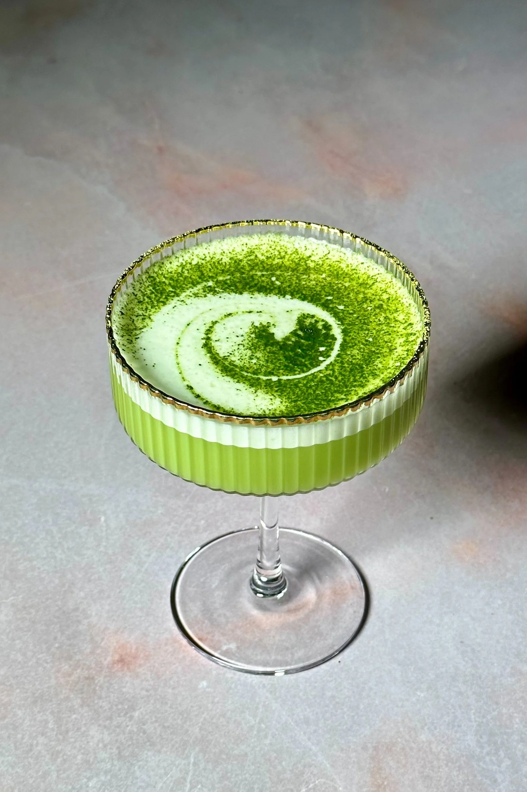 4. Double strain into coupe glass and garnish with sifted matcha. Use the back end of a bar spoon to create a swirly effect.